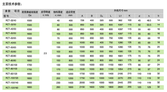 RCT(RCTG)系列永磁滚筒亦称磁滑轮或干式大块磁选机。其内部采用高性能硬磁材料组成复合磁系。具有磁场强度高、深度大、结构简单、使用方便、不需维修、不消耗电力、常年使用不退磁等特点。可用于水泥、磁选、矿山、钢铁、化工、耐火材料、垃圾处理等行业的选铁。与DT-75型、AD-80型通用固定式皮带输送机配套使用代替主动轮或从动轮,也可与专用皮带输送机配套使用。特别适用于钢渣、矿渣、水渣的连续自动除铁。